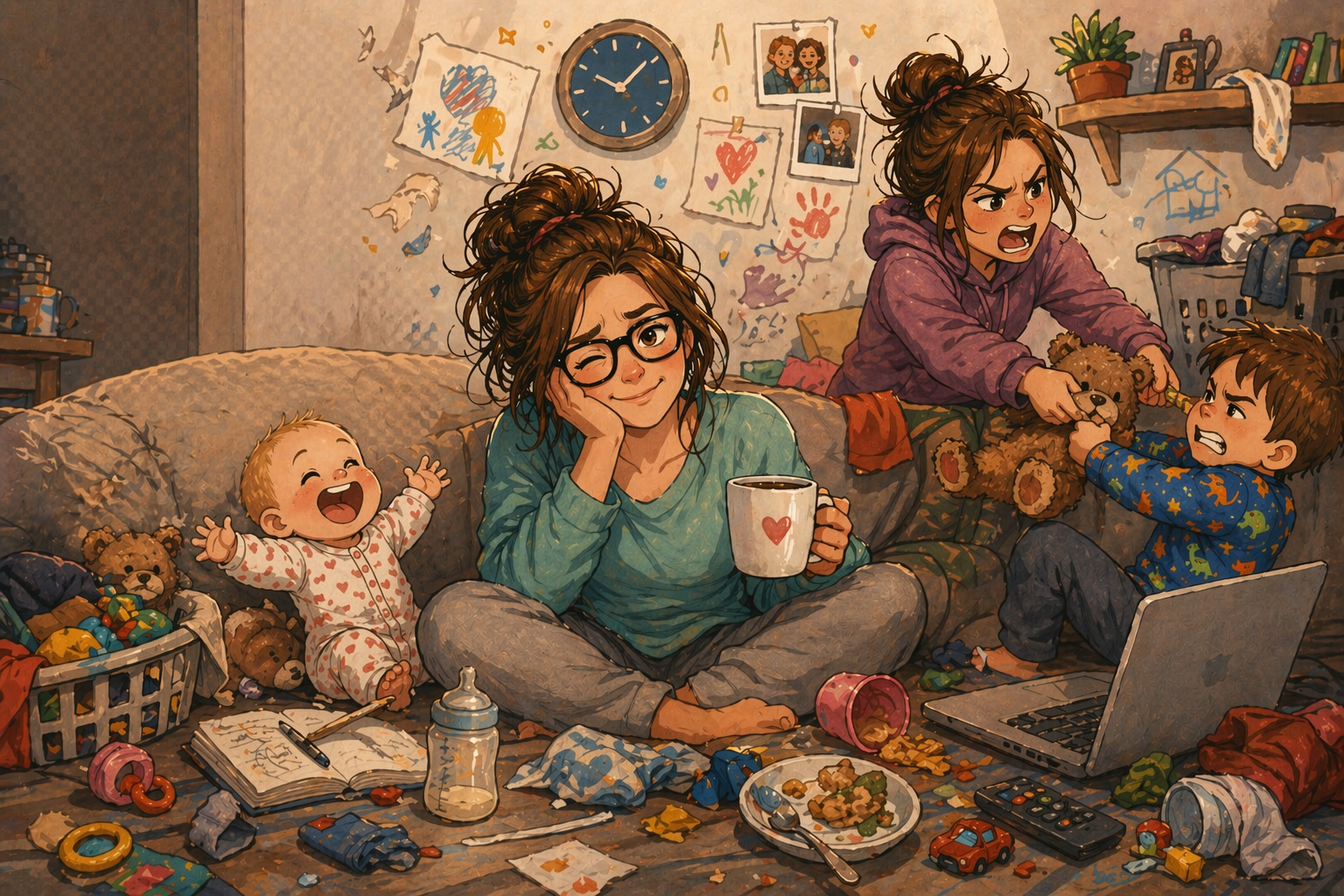 Être maman de trois enfants, c’est vivre dans un tourbillon permanent. C’est arbitrer des conflits absurdes, chercher des chaussettes disparues comme si ta vie en dépendait, et boire du café froid avec résignation… mais aussi rire sans prévenir, recevoir des câlins collants, et entendre “maman” comme le mot le plus important du monde.